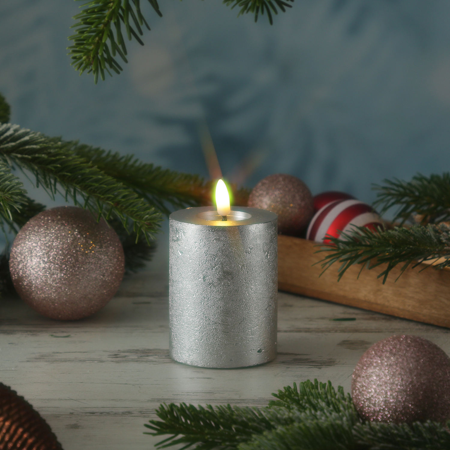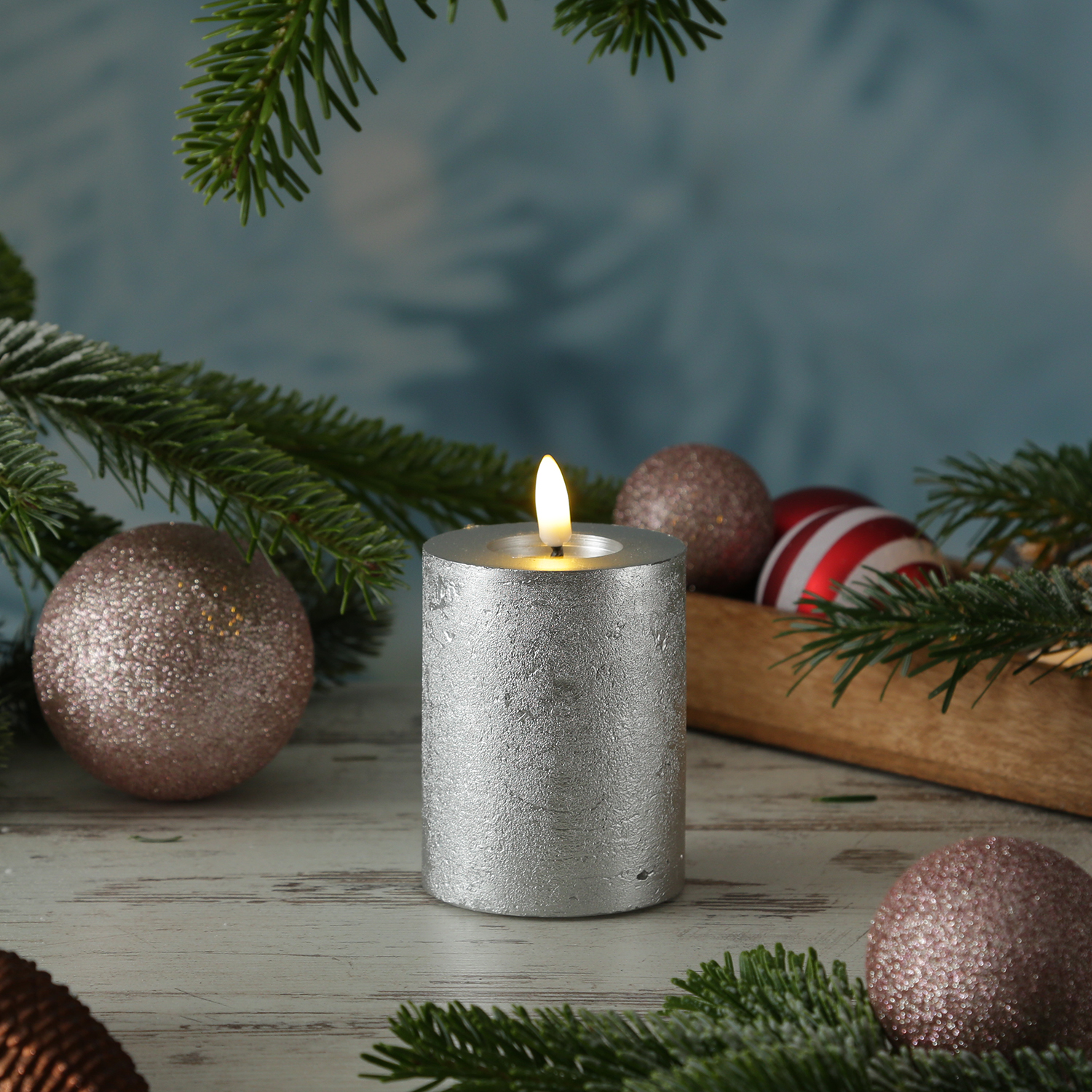 LED Kerze LINA - Rustik-Optik - Echtwachs - 3D Flamme - H: 11cm - D: 7cm - Batterie - Timer - silber