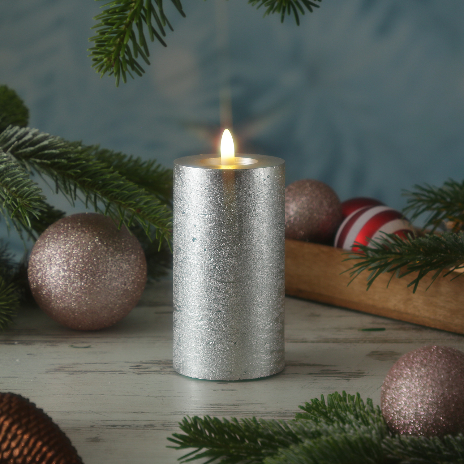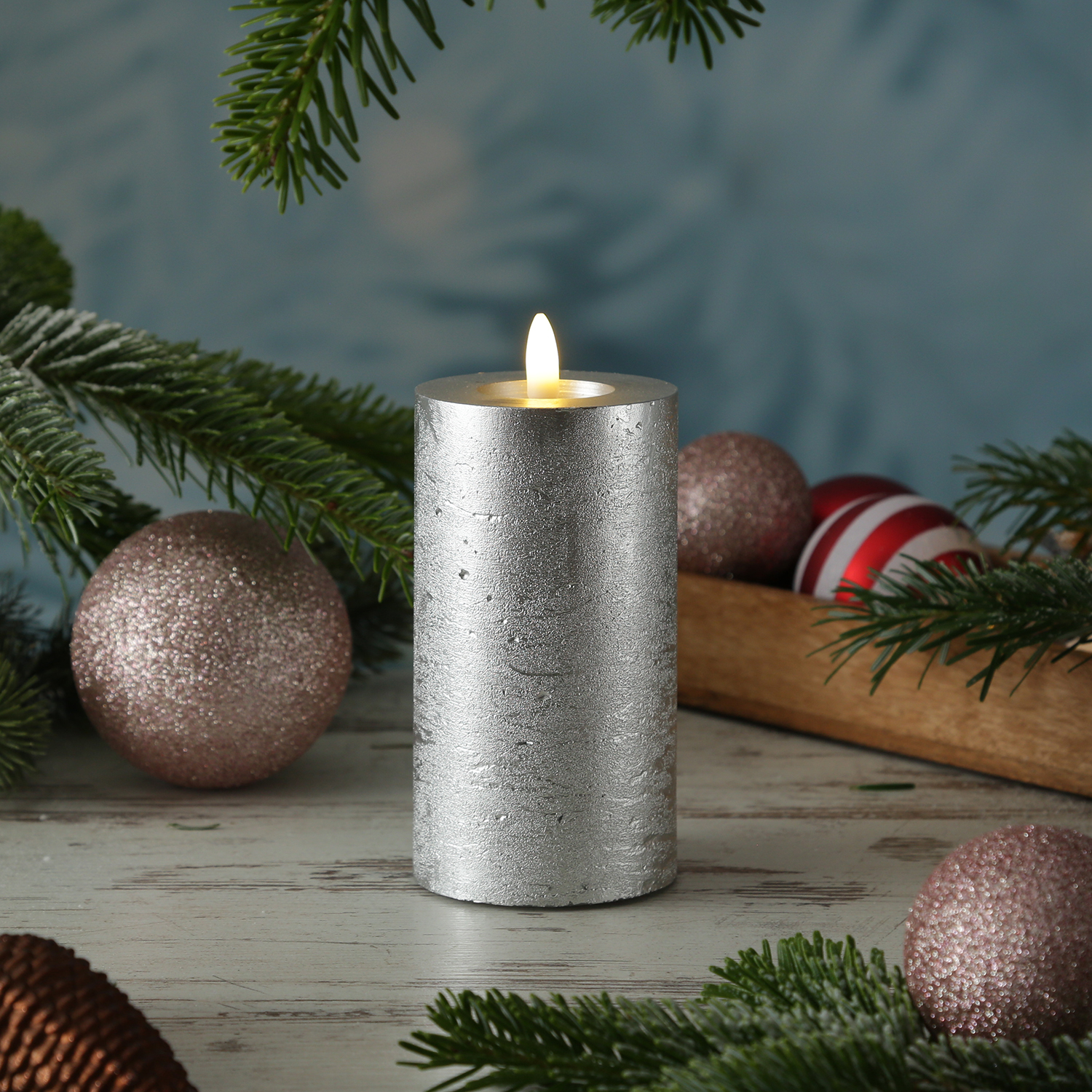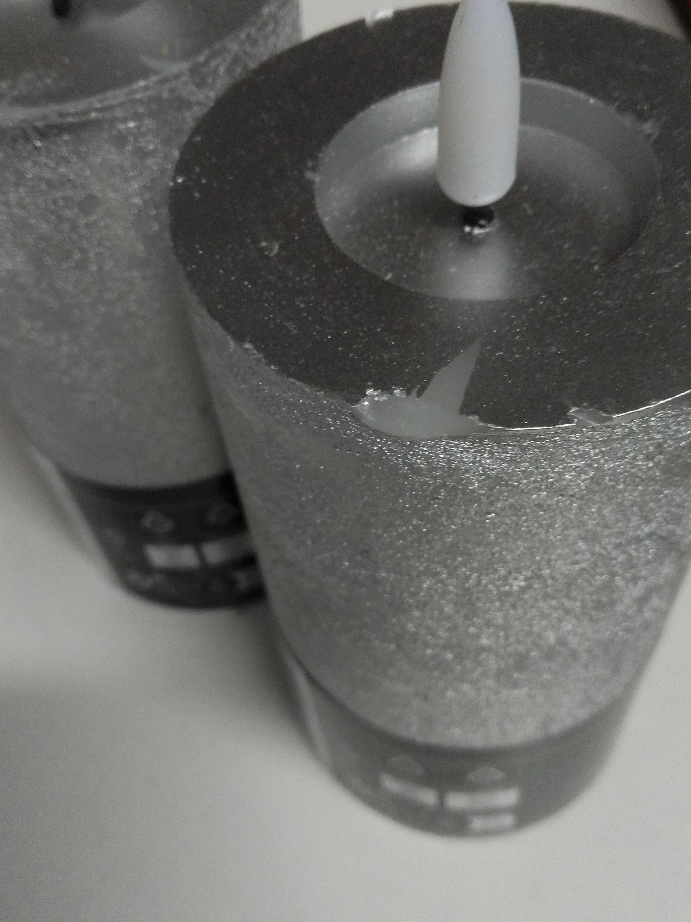 LED Kerze LINA - Rustik-Optik - Echtwachs - 3D Flamme - H: 15cm - D: 7cm - Batterie - Timer - silber