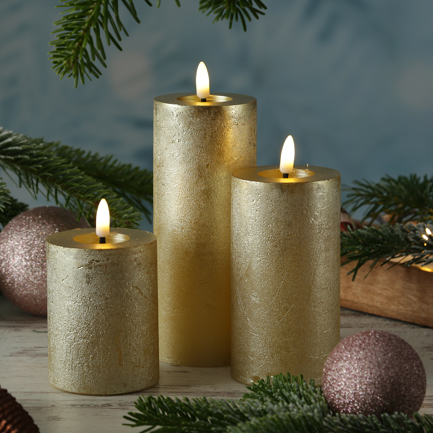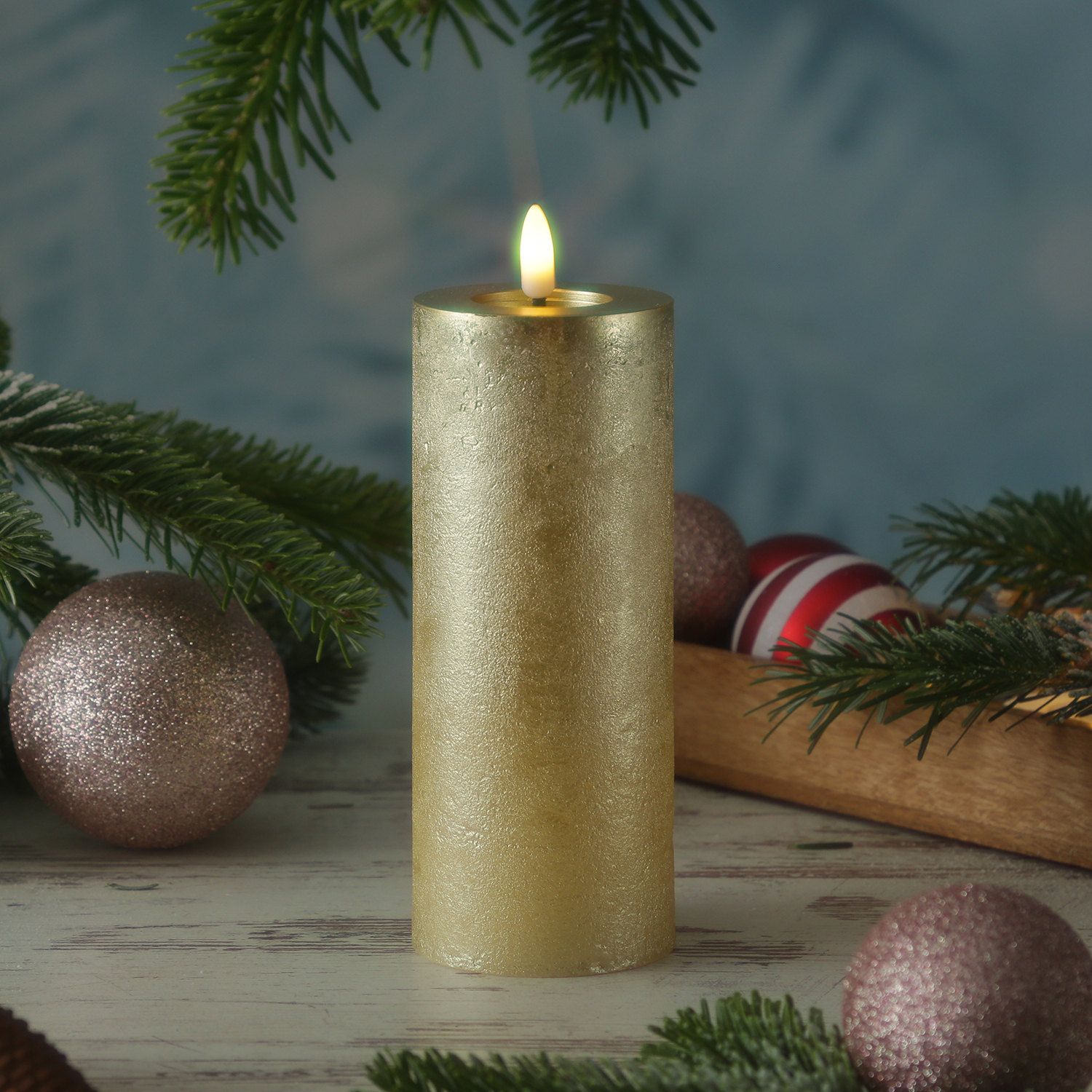 LED Kerze LINA - Rustik-Optik - Echtwachs - 3D Flamme - H: 19cm - D: 7cm - Batterie - Timer - gold