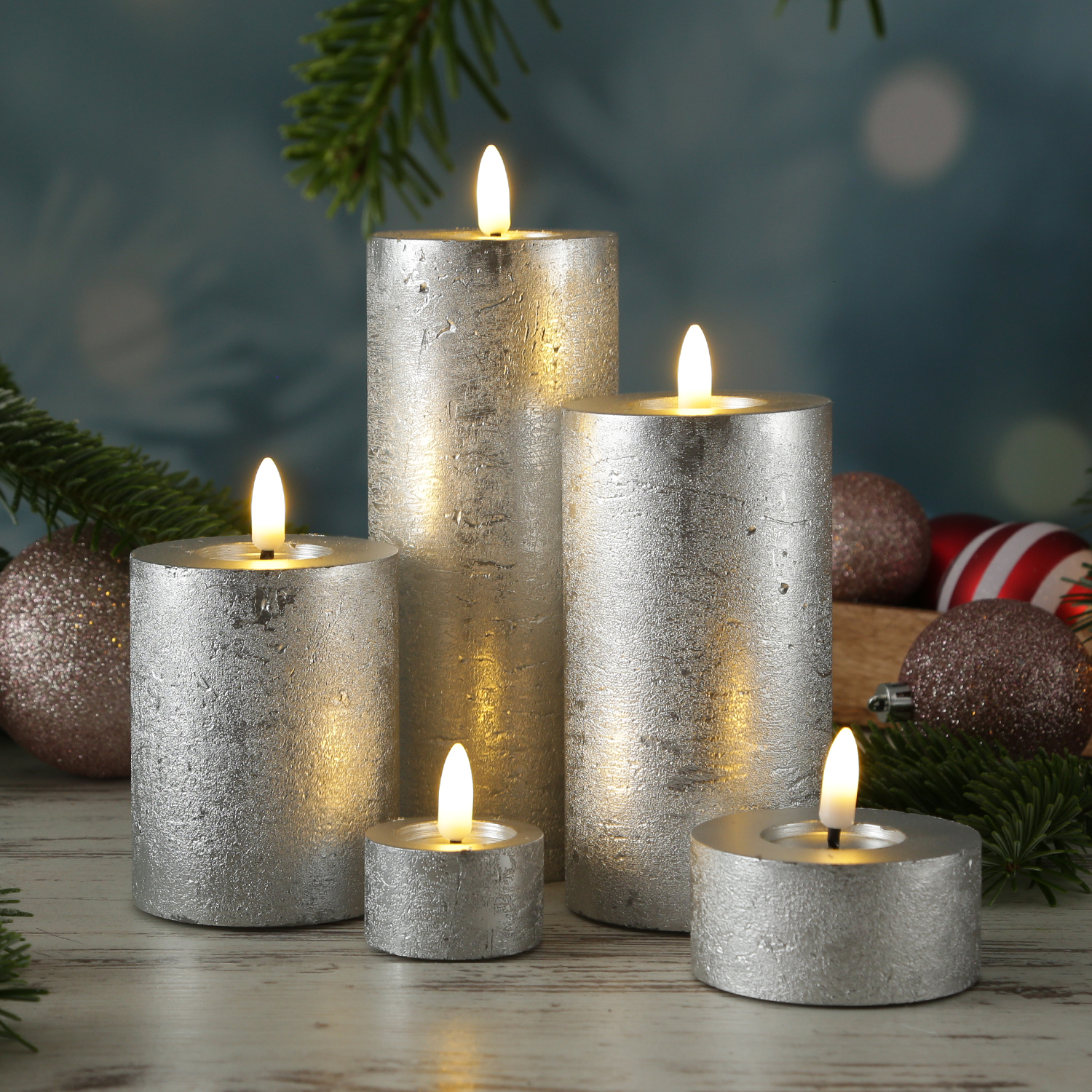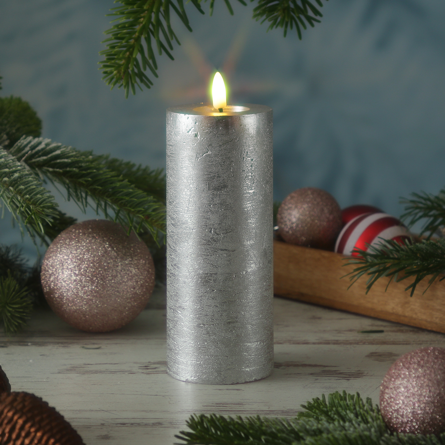 LED Kerze LINA - Rustik-Optik - Echtwachs - 3D Flamme - H: 19cm - D: 7cm - Batterie - Timer - silber