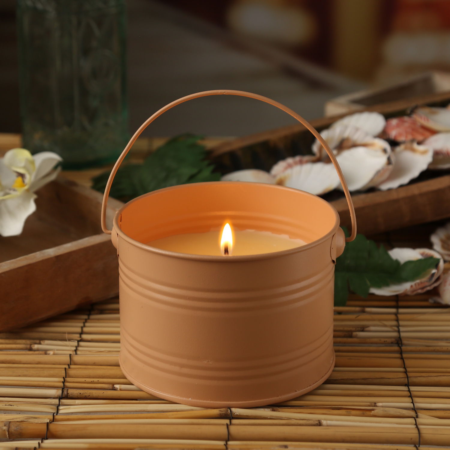 Die Citronella Kerze in dem kleinen orangefarbenen Metalleimer mit Henkel sieht einfach klasse in Deinem Garten, auf dem Balkon oder der Terrasse aus.