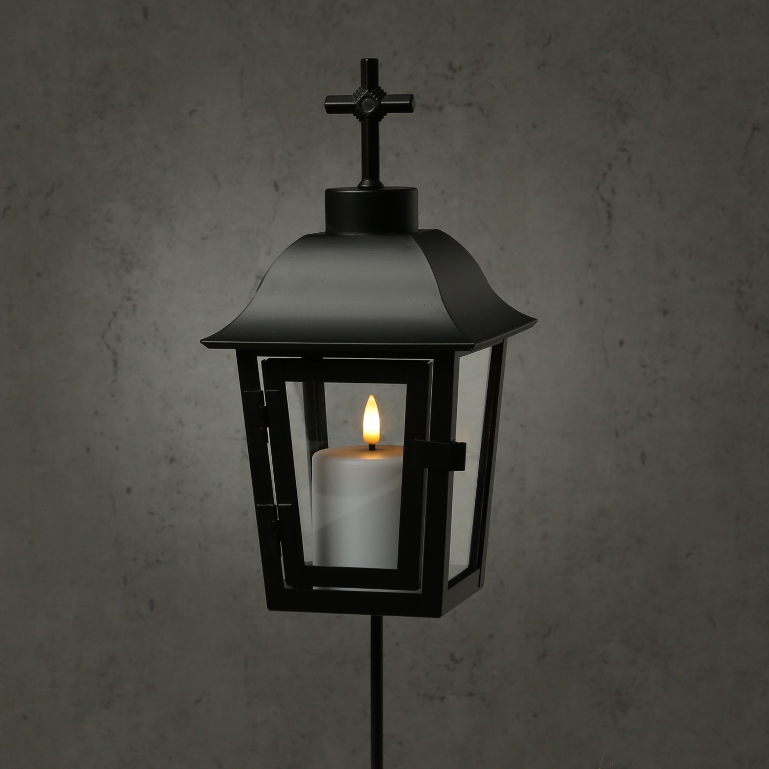Diese dekorative Grablaterne wird mit einer weißen Mini LED Kerze geliefert, die sowohl für den Außenbereich als auch für den Innenbereich geeignet ist.