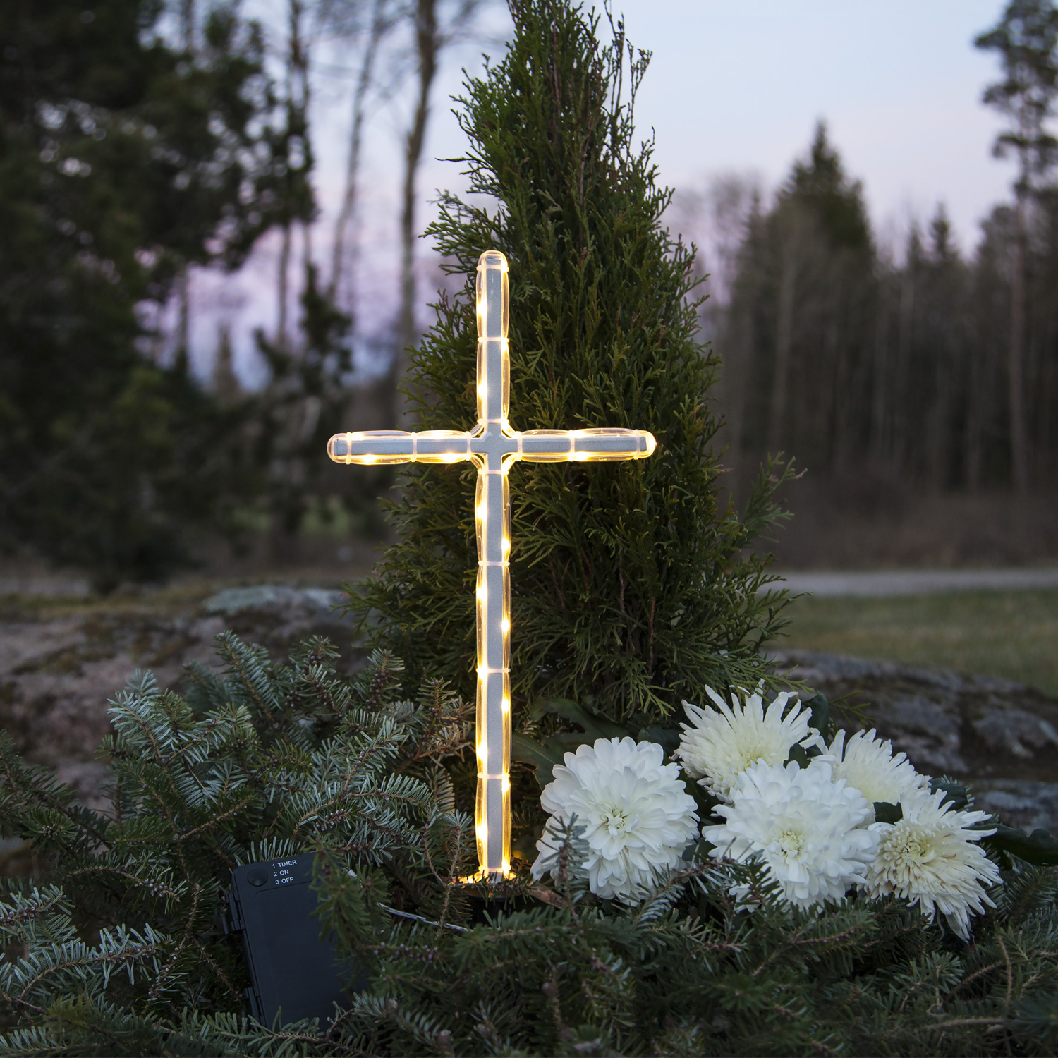 LED Grabkreuz 41cm - weißes Kreuz - 24 warmweiße LED - Batteriebox ca. 1 Monat/Satz - Timer